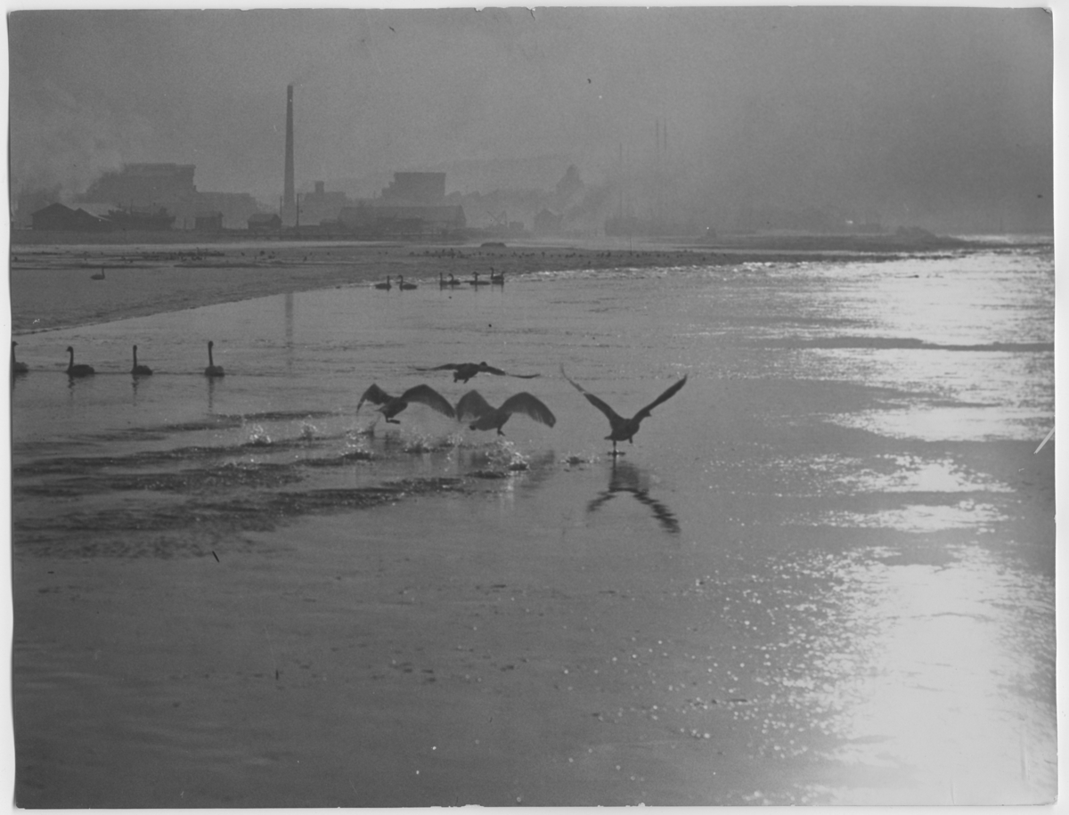 '4 svanar som lyfter från älven utanför Bohus. Ett antal svanar i vattnet. I bakgrunden syns byggnader och skorstenar. :: :: Ingår i serie med fotonr. 1373-1379.'