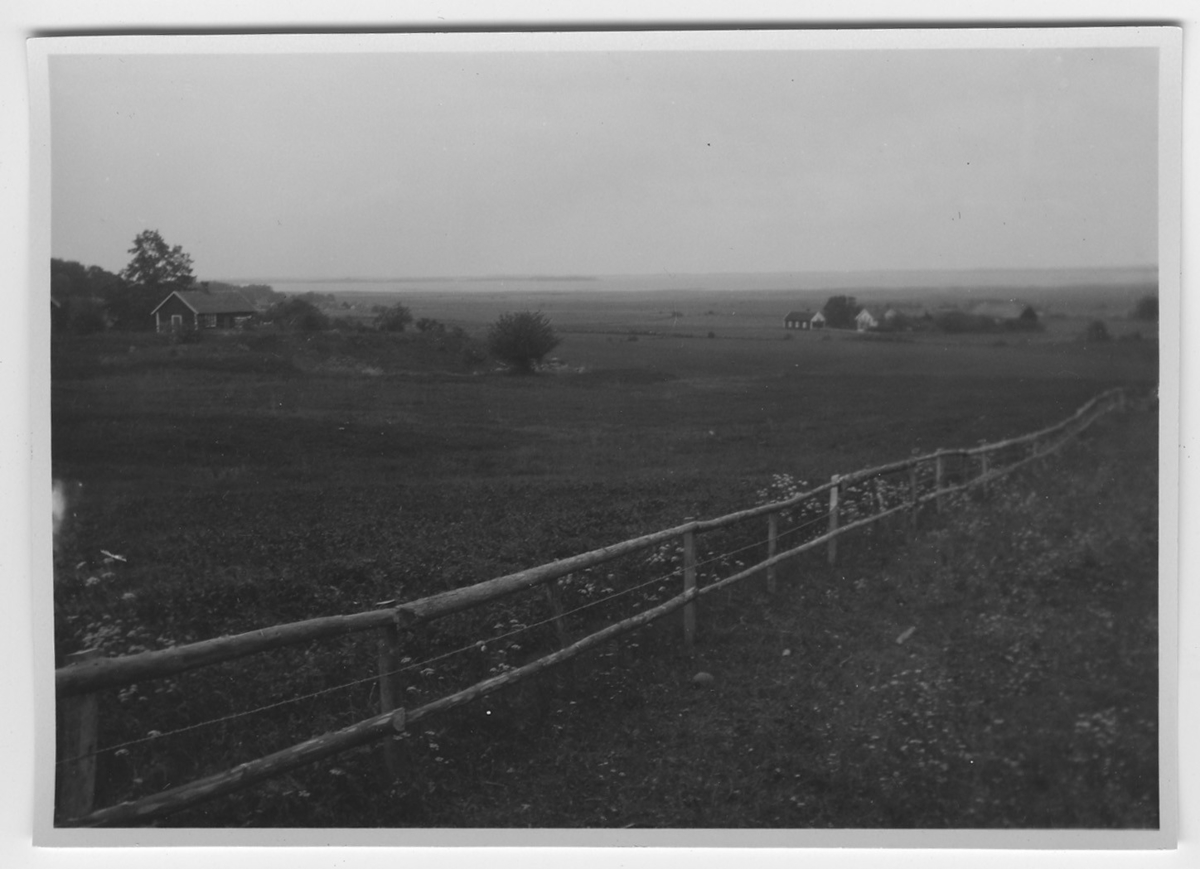 'Vy med trähägnad och hus i förgrunden, öppna fält och på avstånd sjön Tåkern sedd från Obergsvägen. :: :: Se serie med fotonr. 1305-1356.'