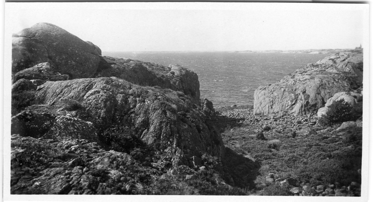 'Från Rödbergets norra sluttning, Lysekils kyrka längst t.h. Vy över hav och berg. Samma vy som fotonr. 1949. :: :: Serie fotonr 1888-1963.'