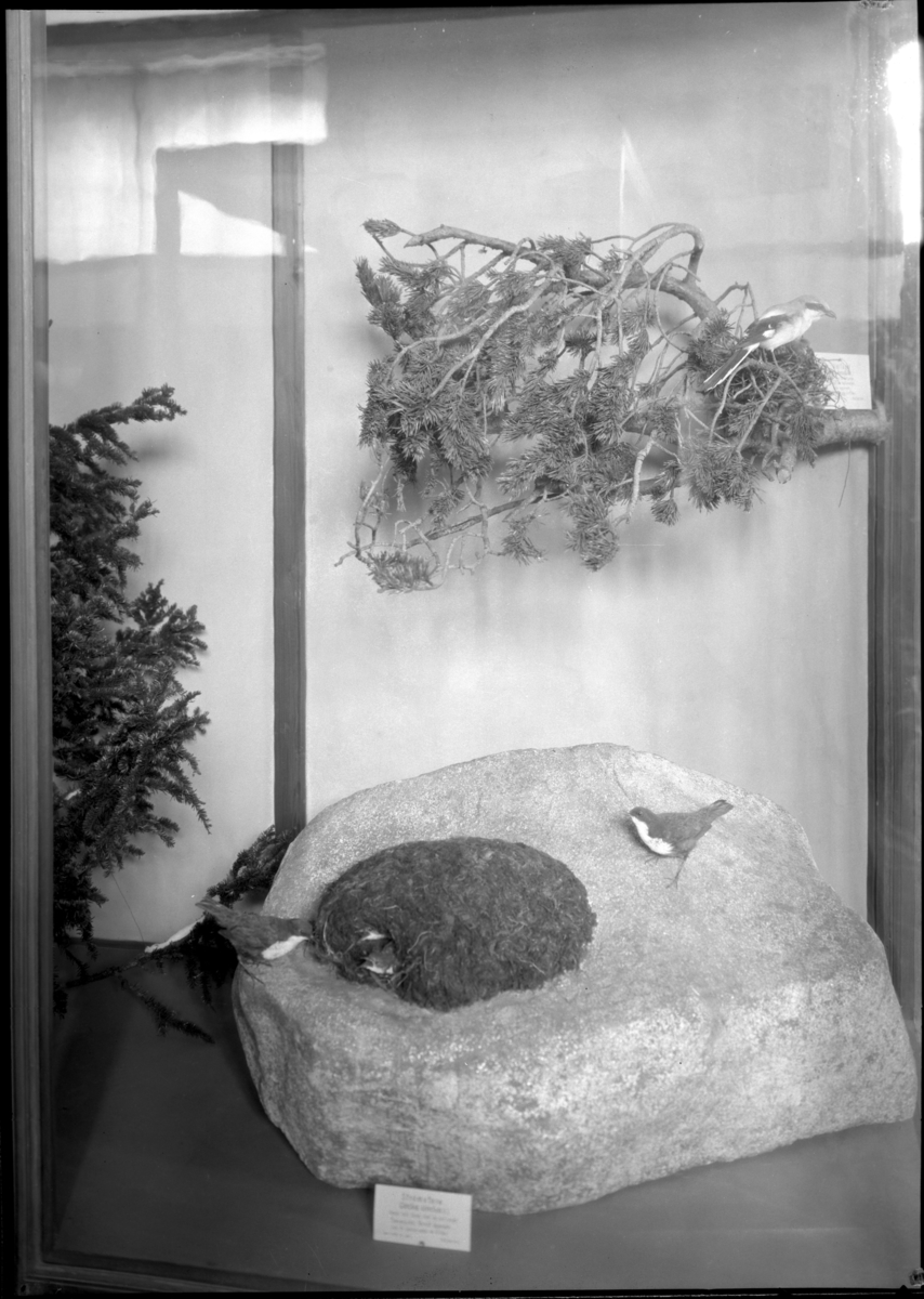 'Biologisk grupp med strömstarar i glasmonterskåp i fågelgången i delen med biologiska grupper. Strömstarar vid boet på stenblock. :: På baksidan av papperskopian står: ''Obs! Endast den stora stenen med på den sittande fåglar och bo medtages.'' :: :: Ingår i serie med fotonr. 2735-2769.'