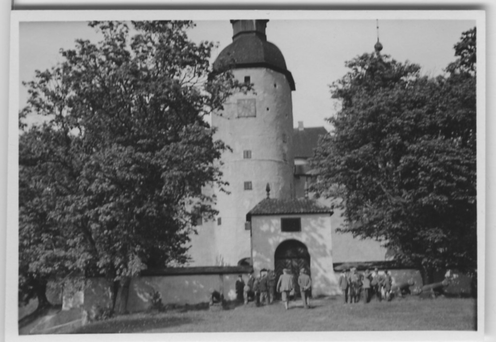 'Biologiska föreningens utfärd till Läckö och Ekens skärgård: :: :: Ca 15 personer framför mur och entreport till Läckö slott. Stora lövträd och kanoner framför muren. :: :: Se fotonr. 3242-3254, 3255, 3256-3259, 3260-3285 samt 3889-3894.'