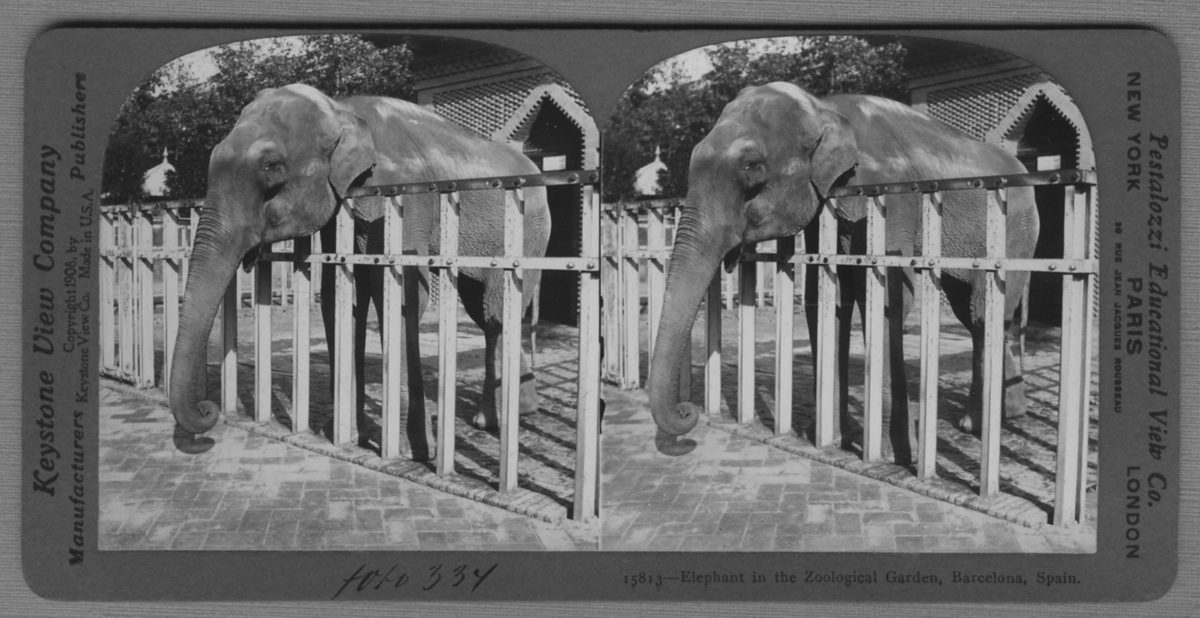 'Inhägnad elefant. :: :: ''15813 - Elephant in the Zoological Garden, Barcelona, Spain.'' :: :: Ingår i serie med fotonr. 315-422.'