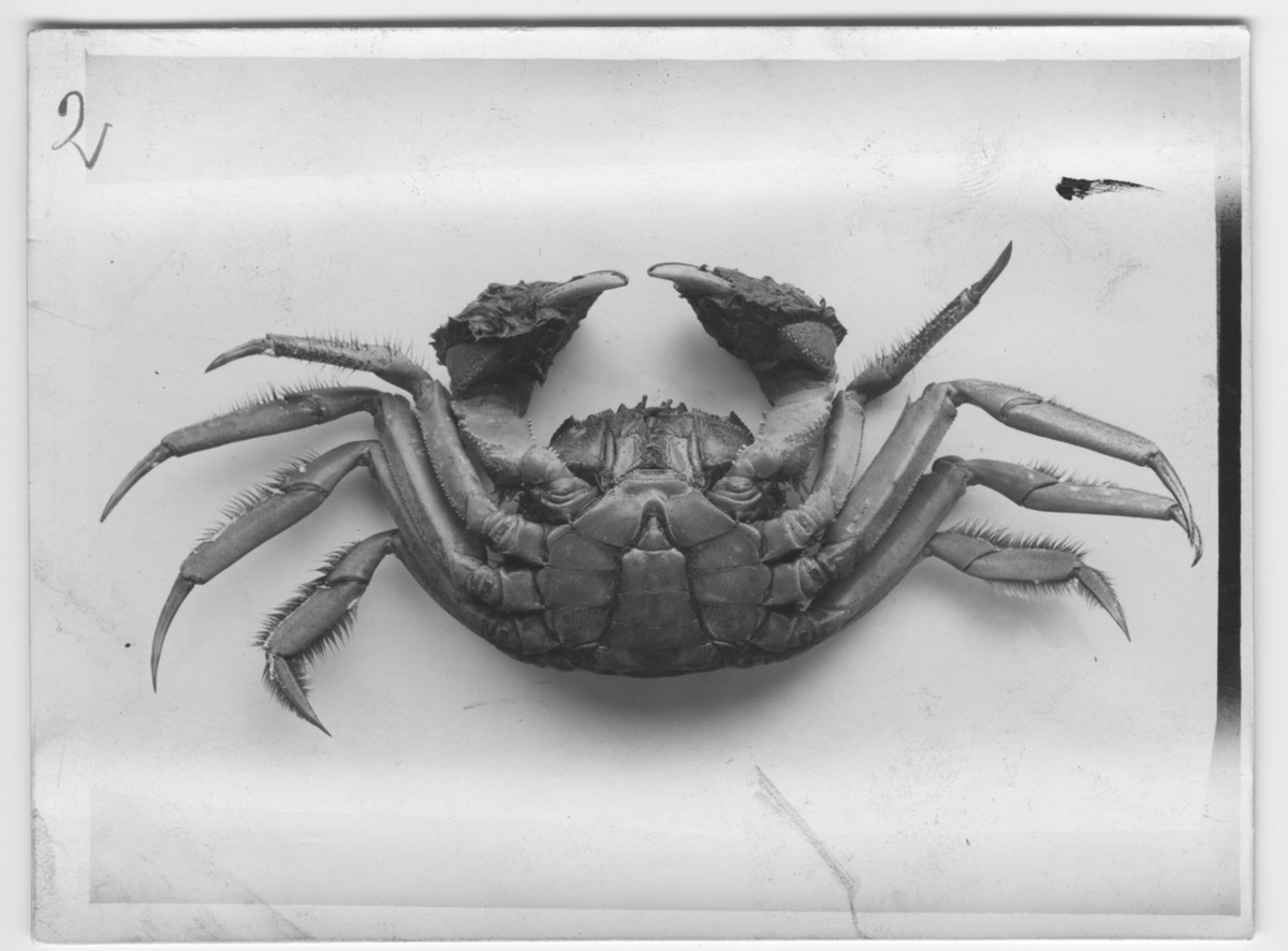 Kinesisk ullhandskrabba, sedd från buksidan.