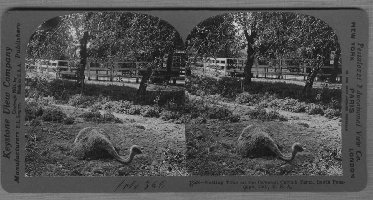 'Ruvande struts. Hägnad i bakgrunden. :: :: ''13526 - Nesting time on the Cawstone Ostrichfarm, South Pasadena,Cal., U.S.A.'' :: :: Ingår i serie med fotonr. 315-422.'