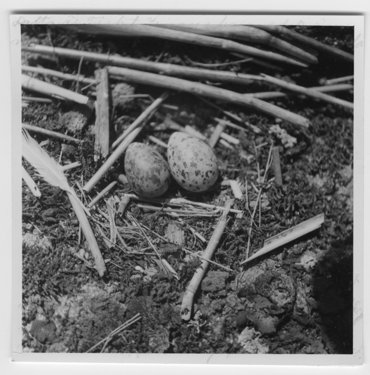 'Bo med 2 ägg av fiskmås. :: :: Text på fotot: ''Detta är fiskmåsens bo med 2 st ägg, nyvärpta i en jordhåla. Boet med vasspinnar bredvid äggen. :: :: Ingår i serie med fotonr. 4545:1-34.'