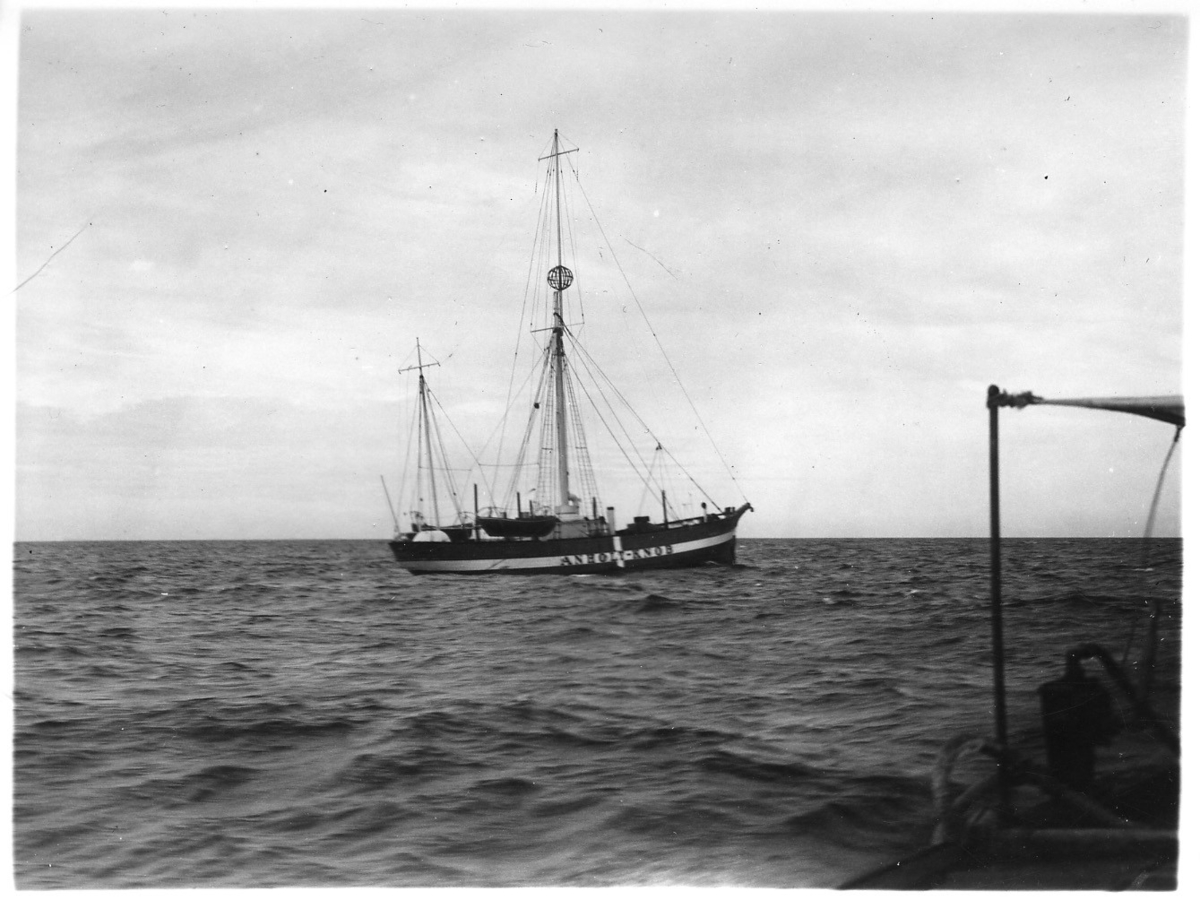 'Kattegattexpeditionen 1933: :: :: Fyrskeppet ''Anholt Knob'', sett från sidan. Båt. :: :: Ingår i serie med fotonr. 2804-2826.'