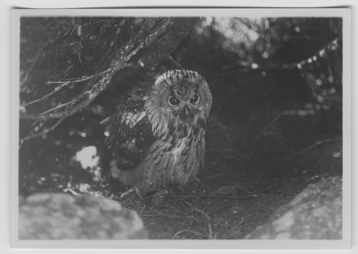 'Berguv, ung, under grangren. Närbild. :: :: Se serie med fotonr. 3151-3200. Se även fotonr. 1771-1837.'