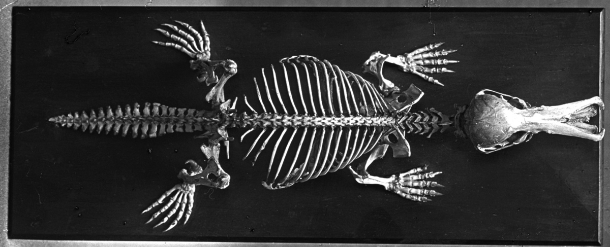 'Monterat skelett av näbbdjur, sett från ryggsidan. :: :: Från Dr. Schlüter & Mass, Halle a S naturvetens. Läromedel. Numrerade Serie I.A. Nr 1-30. :: :: Ingår i serie med fotonr. 5374:1-30. Se även hela fotoserien 5374-5376.'