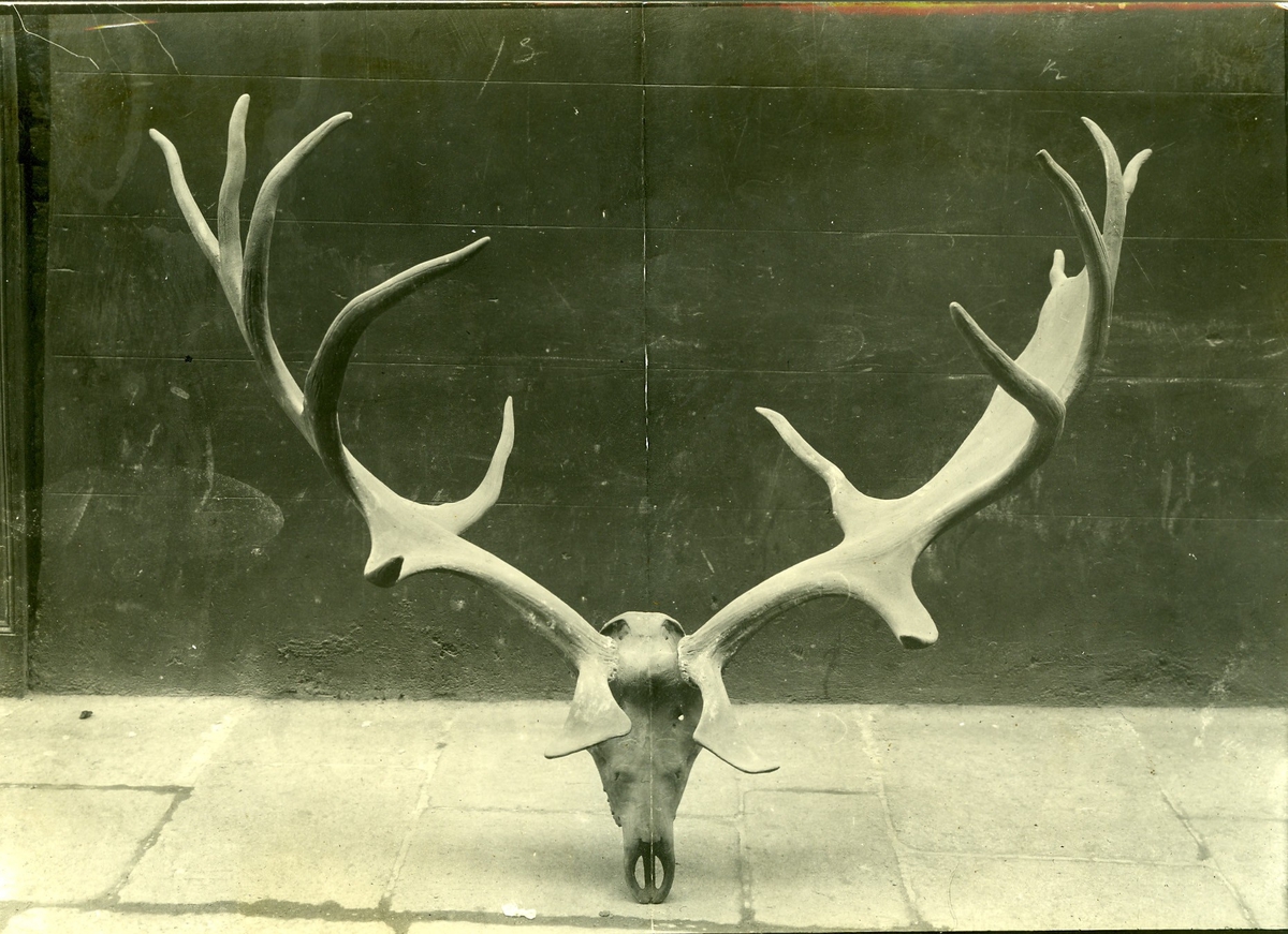 'Hjortkrona med tillhörande överskalle. Tvärmått 2,12 m, omkrets 3,40 m :: 17 spetsar. :: :: Se fotonr. 265-268.'