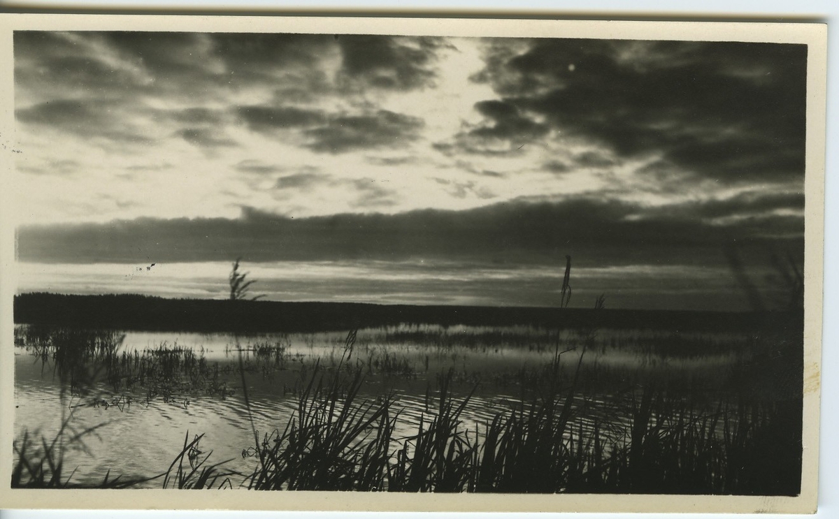 'Aftonstämning vid sjö. Vy med vass, sjö och skogsridå i bakgrunden. :: :: Serie fotonr 953-971.'