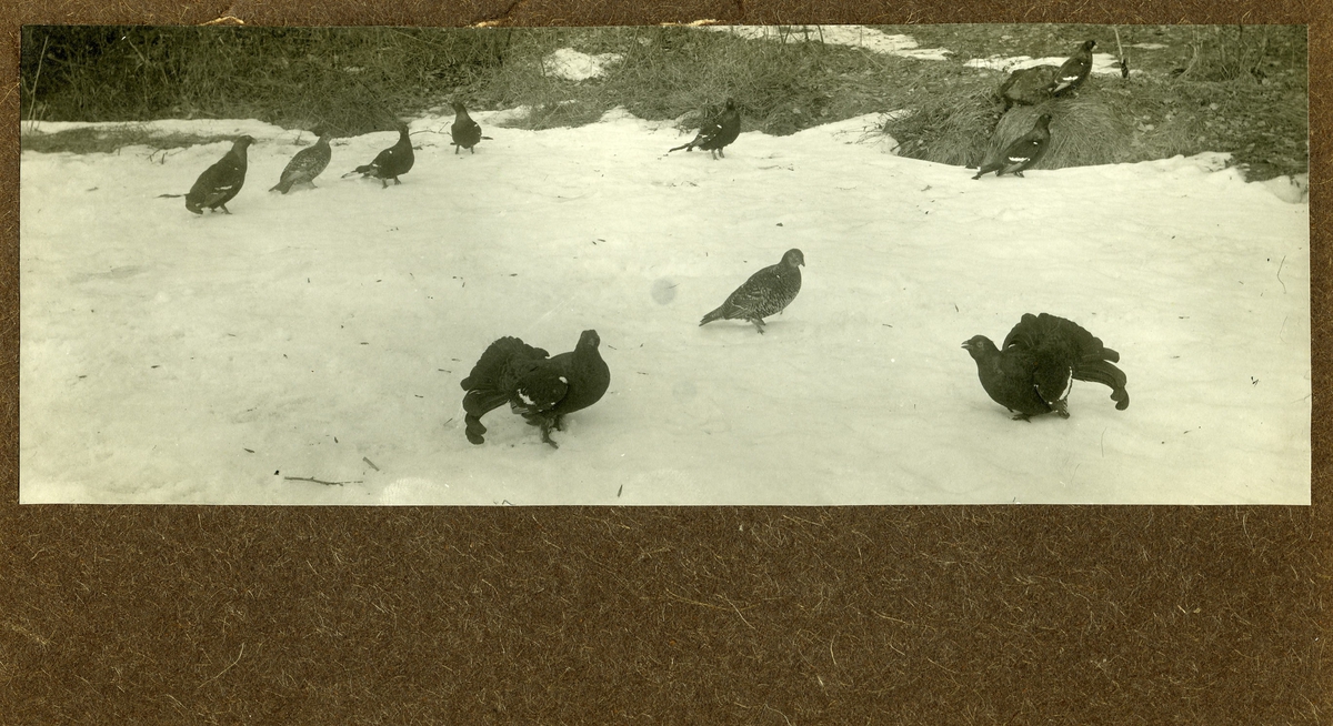 Orrlek, 10 stycken orrar i snö. 2 honor 8 hanar. Snöklädd mark.