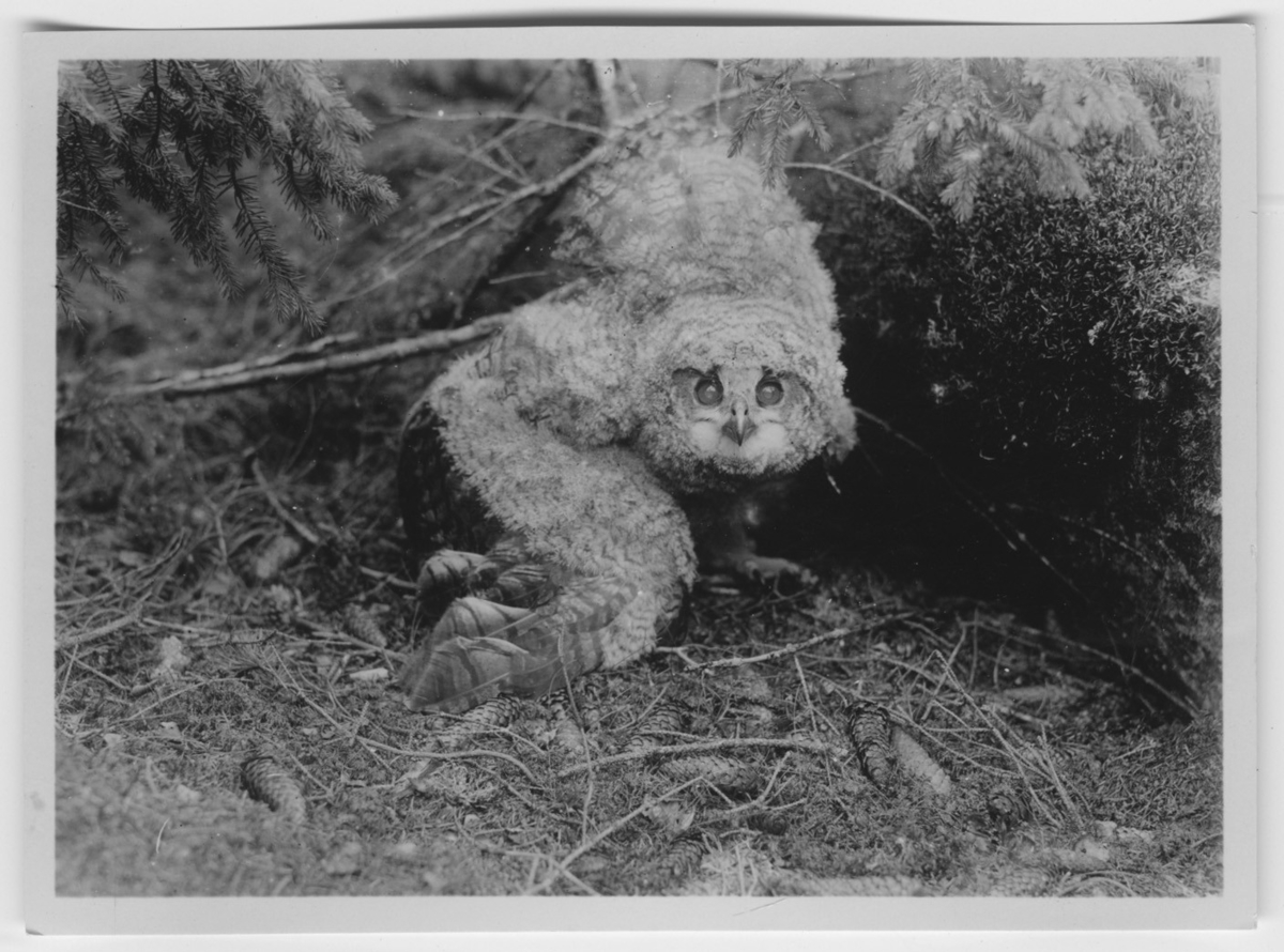 'Berguv på marken, i närbild. Ena vingen framåtfälld. Under gran, grankottar på marken. :: :: Ingår i serie med fotonr. 1771-1837. Se även fotonr. 3151-3200.'