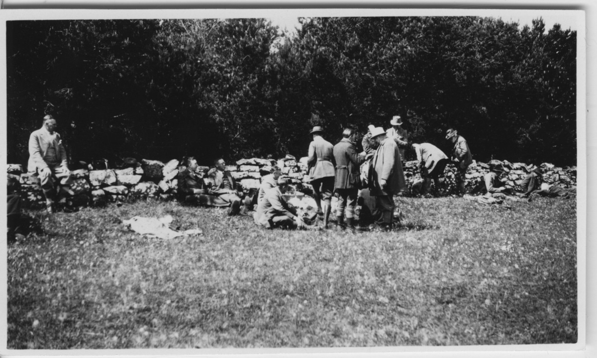 'Biologiska föreningens utfärd till Öland: :: :: Text enligt foto: ''Lunchrast vid Alby skog.'' ca 12 st män samlade framför en stenmur. Stengärdesgård. :: :: Se även fotonr. 2607-2625, 2583-2606 samt 2883-2911 från samma utfärd.'