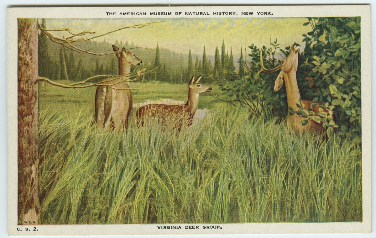 '3 hjortar i högt gräs. Text på baksidan: ''Virginia deer group. One of the most plentiful and the best known of American deer. Ranges from Maine to Florida and from British Columbia to the Gulf of Mexico.'' :: :: Ingår i serie med fotonr. 2941-2954. Se även serie med fotonr. 2930-2940 med vykort delvis samma motiv, icke kolorerade.'