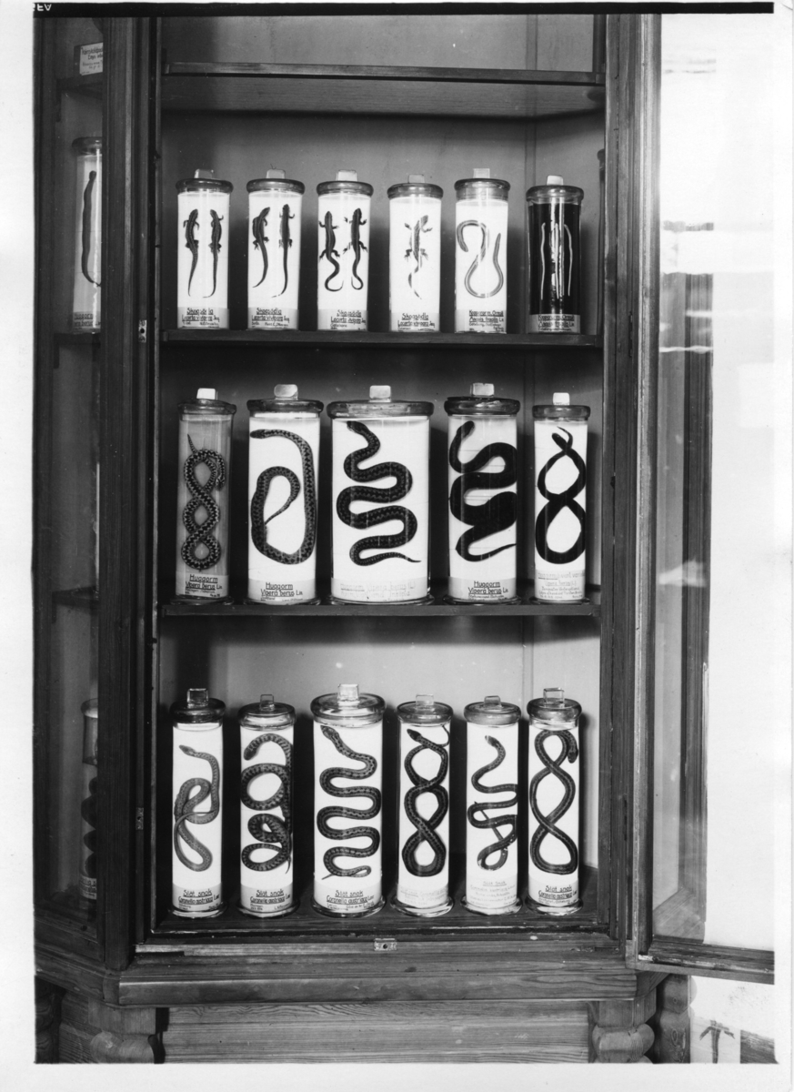 Svenska reptilskåpet: närbild på skåp med 3 hyllor med ormar och ödlor i glasburkar. Överst 4 burkar med skogsödla och 2 burkar med kopparorm (kopparödla). Mellersta hyllan 5 burkar med huggorm och nedersta hyllan 6 burkar med slät snok.