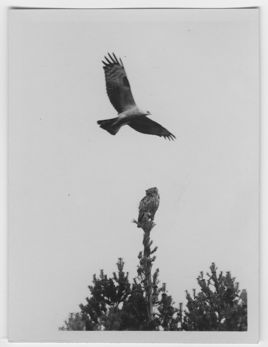 'Flygande bivråk över en uggla som sitter i toppen på en tall. :: :: Ingår i seie med fotonr. 4167-4175.'
