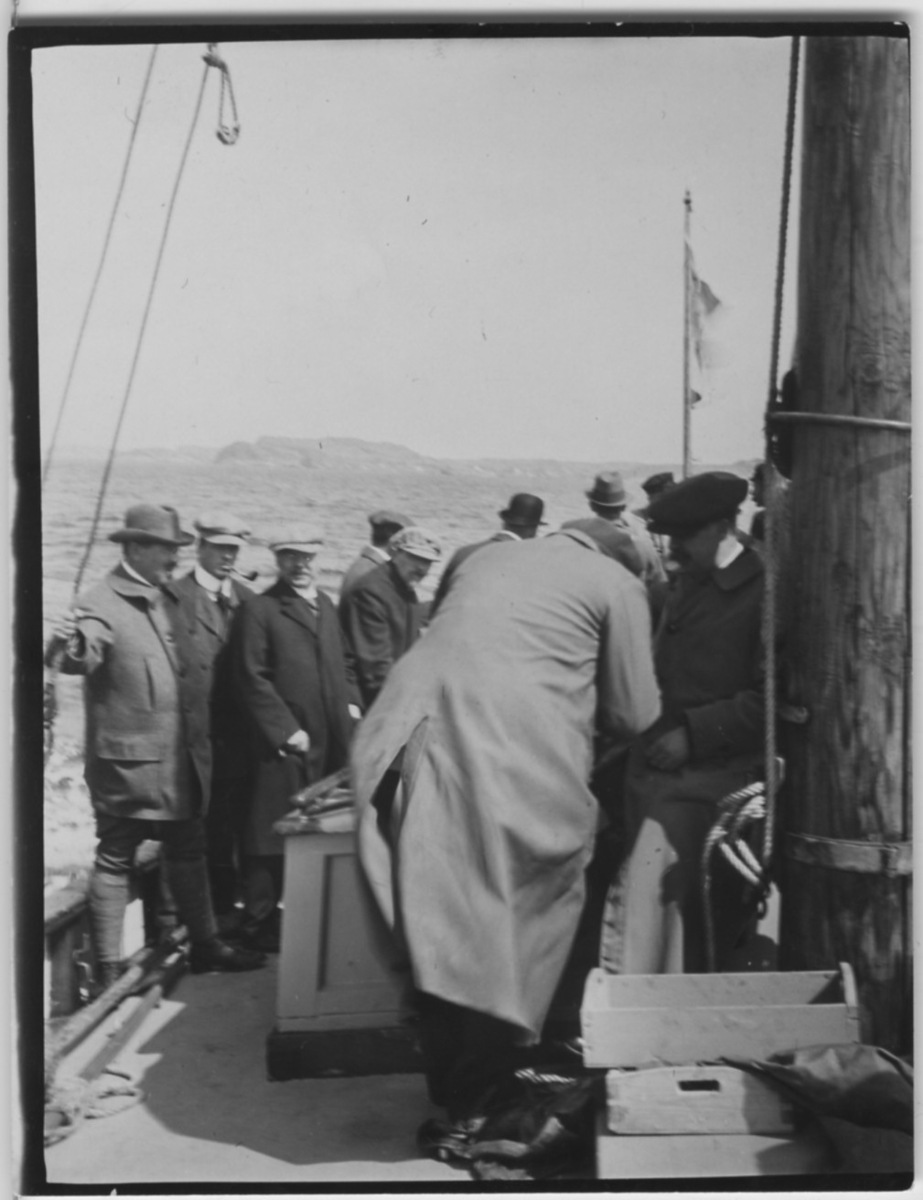 'Biologiska föreningens utfärd till Kristineberg: :: :: 11 män, synliga, ombord på båtdäck. I förgrunden står trälådor. :: :: Ingår i serie med fotonr. 4242:1-14.'