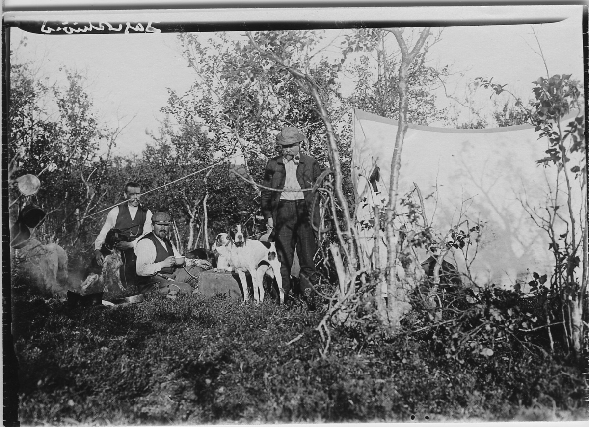 'Från Professor Leonard Axel Jägerskiölds ripjakter vid Fjällåsen. :: :: 3 män och 3 hundar vid en lägereld framför ett tält. Enligt anteckning på baksidan av fotografiet: ''Swärd med sin Seffy, Kihlén, Malmstrand''. Kläder. Klädsel. :: :: Ingår i serie med fotonr. 4312:1-38.'