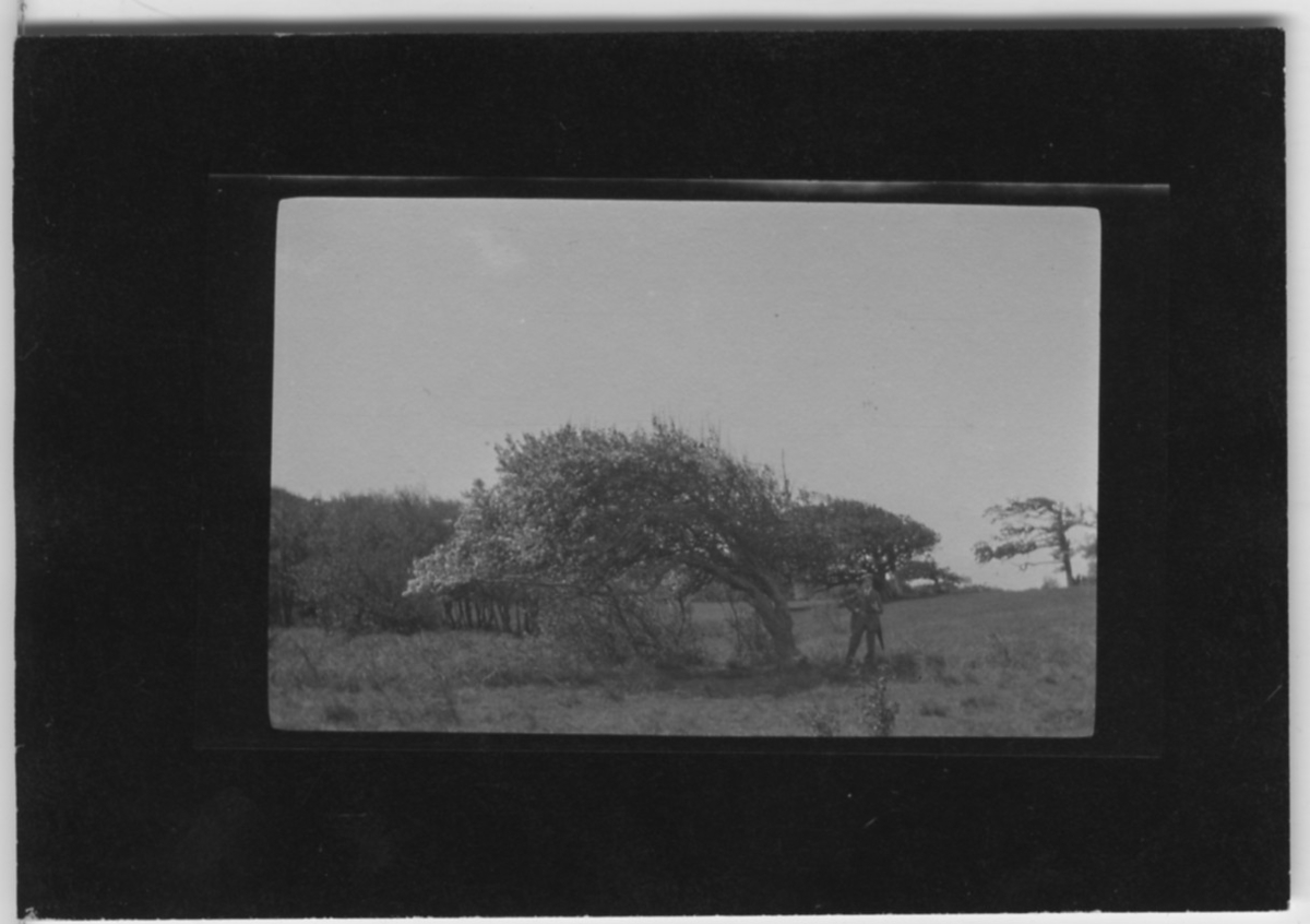 'Biologiska föreningens utfärd till Hallands Väderö: :: :: Vindpinade träd: :: :: Nedböjt träd, en man står bredvid, på öppen mark. Samma motiv som 4311:9. :: :: Se fotonr. 1464 och 4311:1-58 från samma utfärd.'