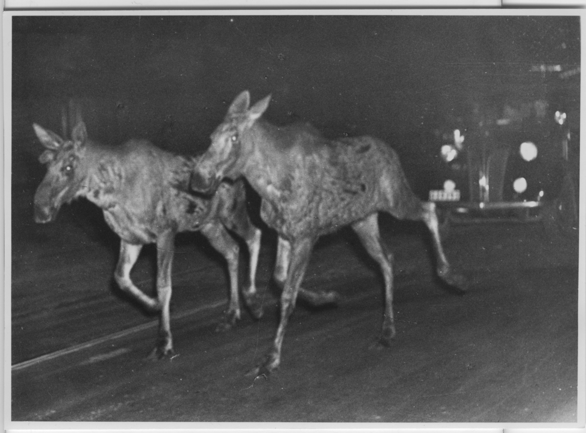 '2 älgar på vägen framför en bil. :: :: Ingår i serie med fotonr. 4497:1-4.'