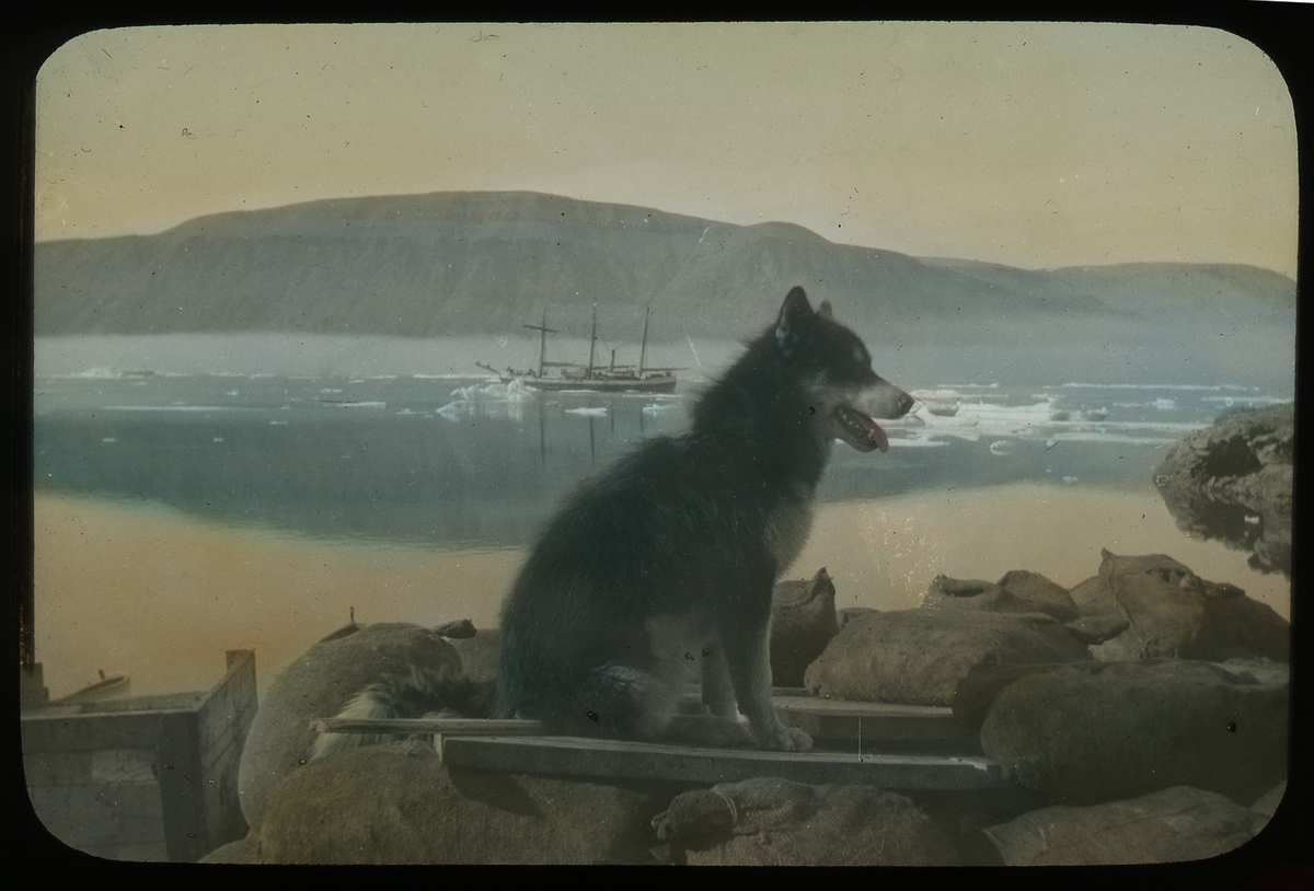 'Eskimåhund i förgrunden med havsvy med isflak och båt. Text på på glaset: ''Eskimo dog. Norlh Devon Island.'' :: :: Ingår i serie med fotonr. 5203:1-22. Se även hela fotonr. 5202-5218 med bilder från Frits Johansen.'