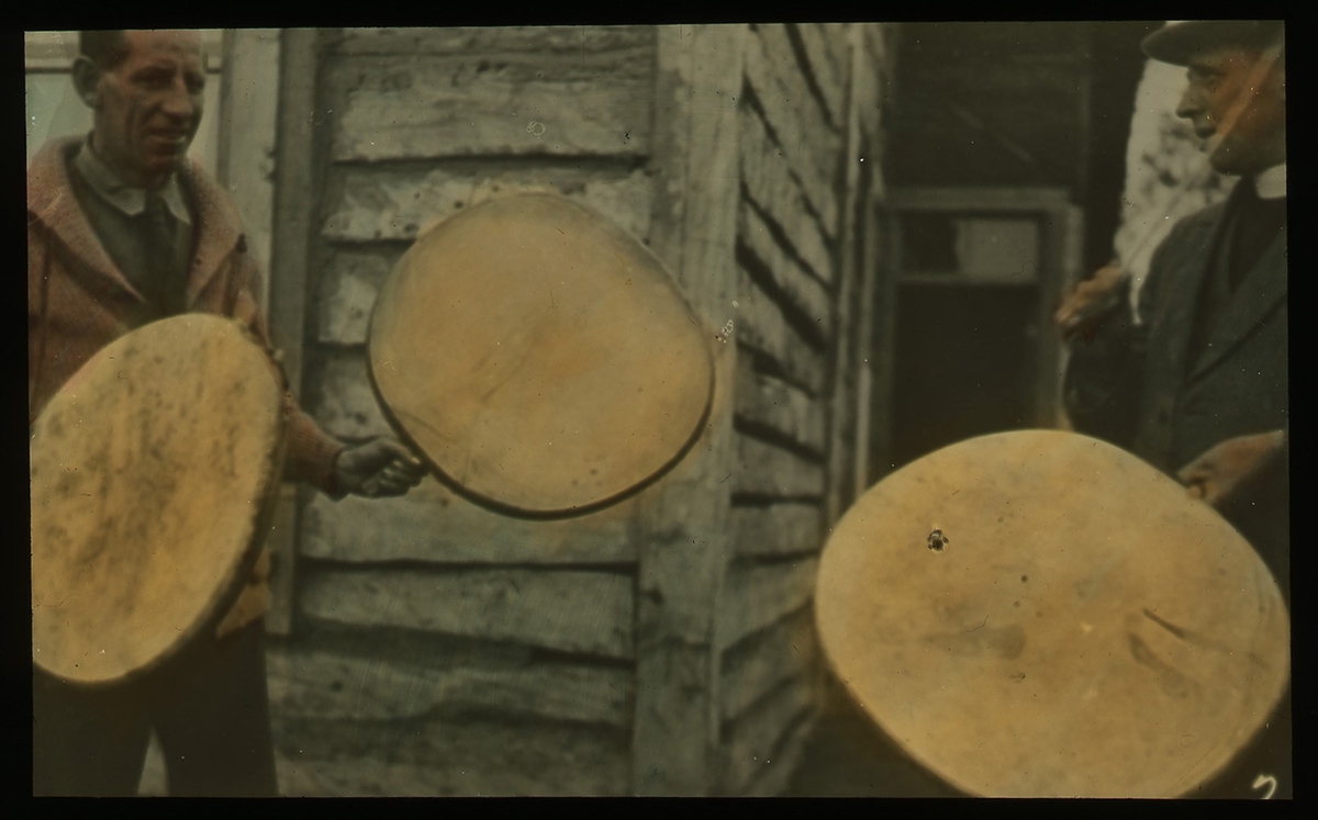 '2 män håller upp 3 st trummor? framför 1 byggnad. Text på glaset: ''Eskimo drunis.'' :: :: Ingår i serie med fotonr. 5203:1-22. Se även hela fotonr. 5202-5218 med bilder från Frits Johansen.'