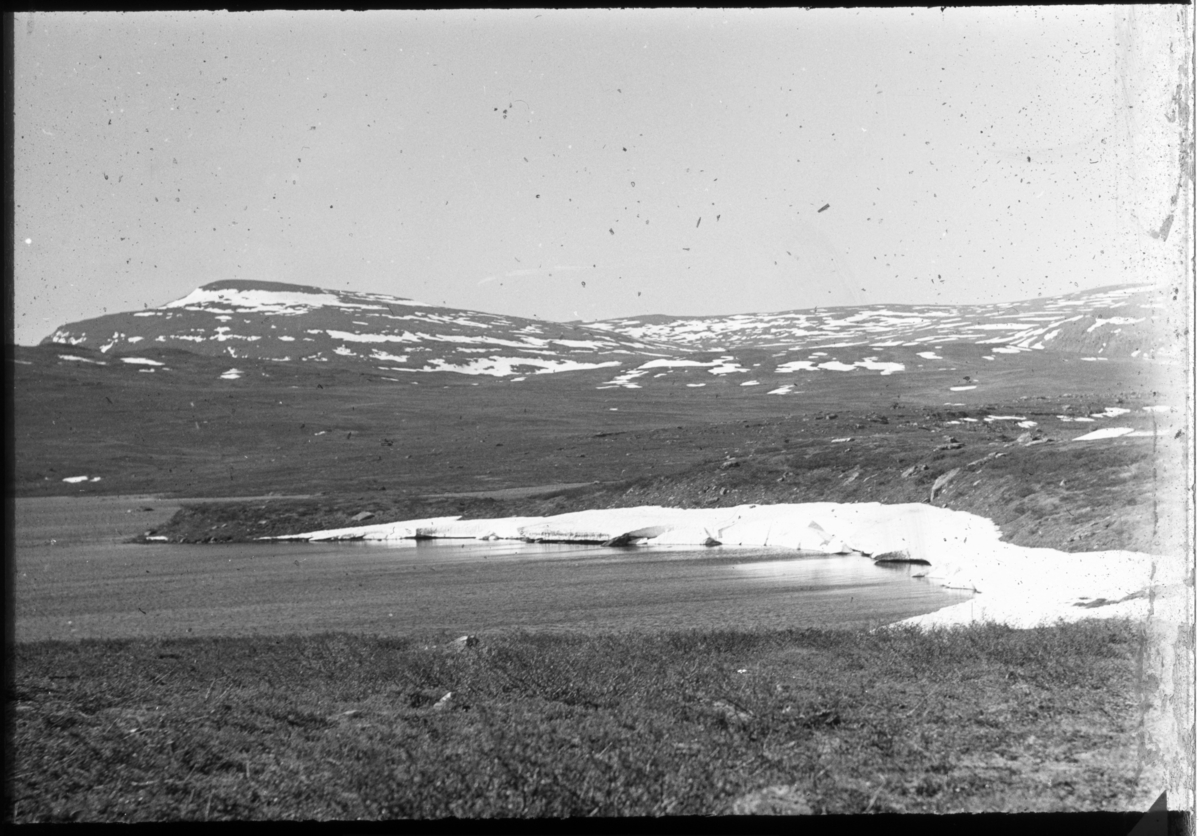 'Bildtext: ''Räkermassivet och Gavasj:e-strandparti.'' Vy med del av sjö med is längs strandkanten. Delvis snöklätt fjällmassiv på avstånd. :: :: Ingår i serie med fotonr. 5166:1-8, numrerade med bildnr 223-230. Se även hela serien med fotonr. 5155-5174.'
