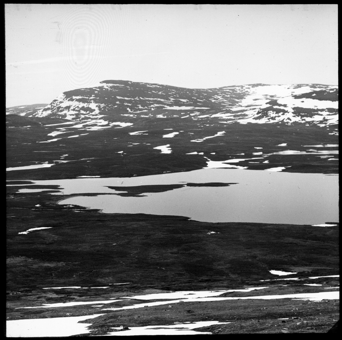 'Bildtext: ''Tjålmejaures östra parti.'' Vy med snölegor, delvis snöklätt berg och sjö. :: :: Ingår i serie med fotonr. 5165:1-7, numrerade med bildnr 216-222.'