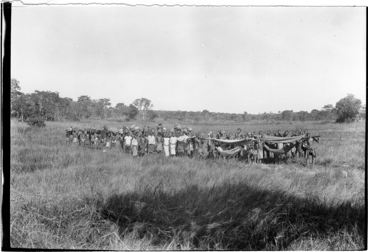 'Diverse fotografier från bl.a. dåvarande Nordrhodesia, nu Zambia, tagna av Konsul Magnus Leijer. :: :: Ett stort antal människor stående i samlad klunga, bärande på diverse packning, korgar, tyger och en säng. Fotograferade från avstånd på ett fält.'