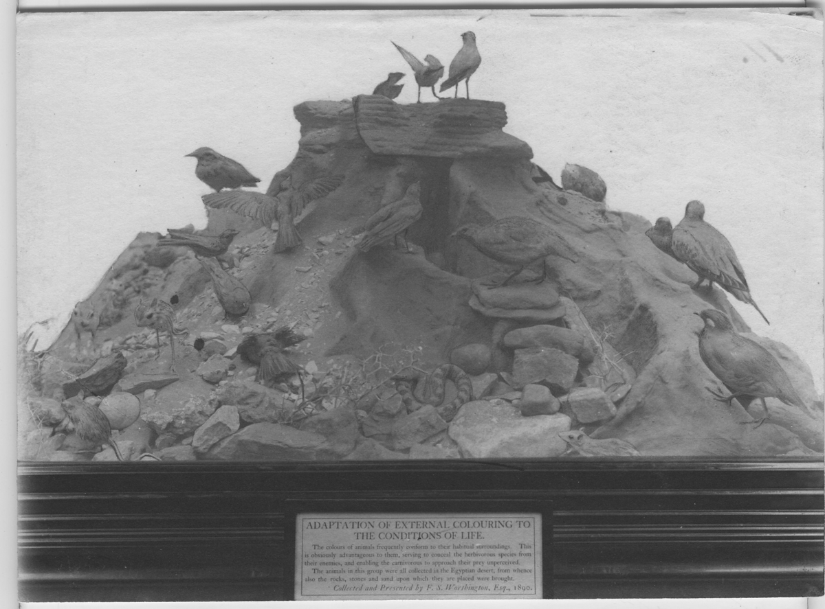 'Div. bilder på ''museala arrangemang av fåglar'', bilderna är insamlade av Leonard Axel Jägerskiöld. :: :: Diverse olika monterade djur på en stenhög, bl.a. fåglar, ormar och gnagare. Enligt skylt på bilden: ''Adaptation of external colouring to the conditions of life'''
