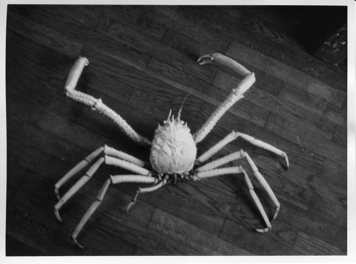 'Bilder från ateljen vid monteringen av ''häxkrabban''. Fynddatum: 1955-07-01. :: :: Fotograferad ovanifrån. :: :: Den japanska jättekrabban finns utställd i monterskåp nr. 94. :: :: Ingår i serie med fotonr. 5674:1-4.'