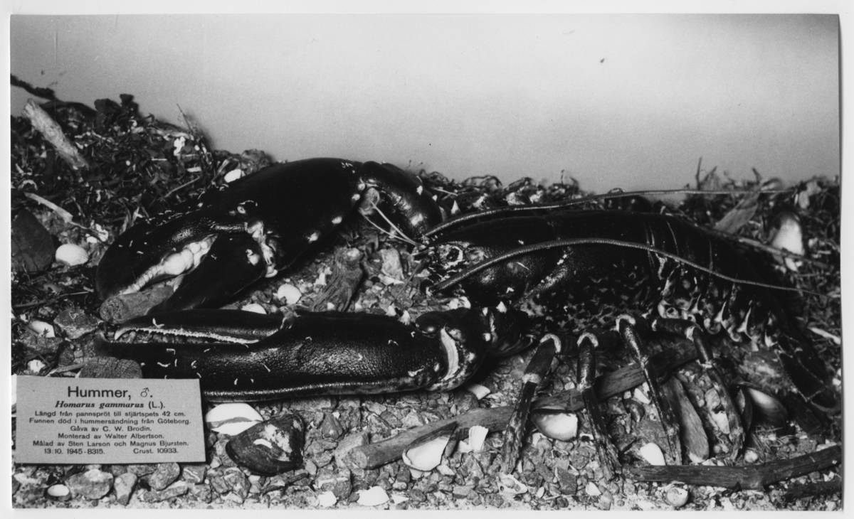 'Bilder från Göteborgs Naturhistoriska museum tagna som övningsuppgift av fotografer på Göteborgs Stads yrkesskolor: :: :: Hummer liggande i utställningsmonter, hona, 42 cm lång från pannspröt till stjärtspets. I monter nr. 93 (år 2007). :: :: Ingår i serie med fotonr. 6953:1-53.'