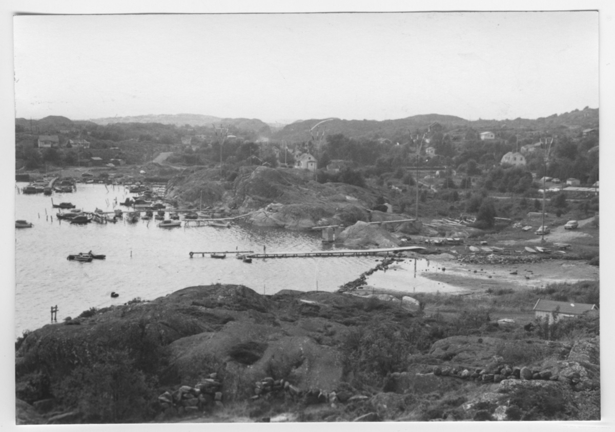 'Bildtext: ''Havsvik i plastiskt skulpterat landskap. Riktning 250.'' Vy över havsvik intill berghällar ligger bryggor och båtar. Hus i fonden. I förgrunden stenmur. Stengärdesgård. :: :: Ingår i serie med fotonr. 6970:1-1125, dokumentation av Hisingens naturgeografi, visande landskapsformerna i stora drag och gjord inför exploateringen av området. Platserna för fotograferingen finns utsatta på karta i skala 1:4000 som finns på Göteborgs Naturhistoriska musem. Fotoriktningen mättes med kompass i gammalgrader.'