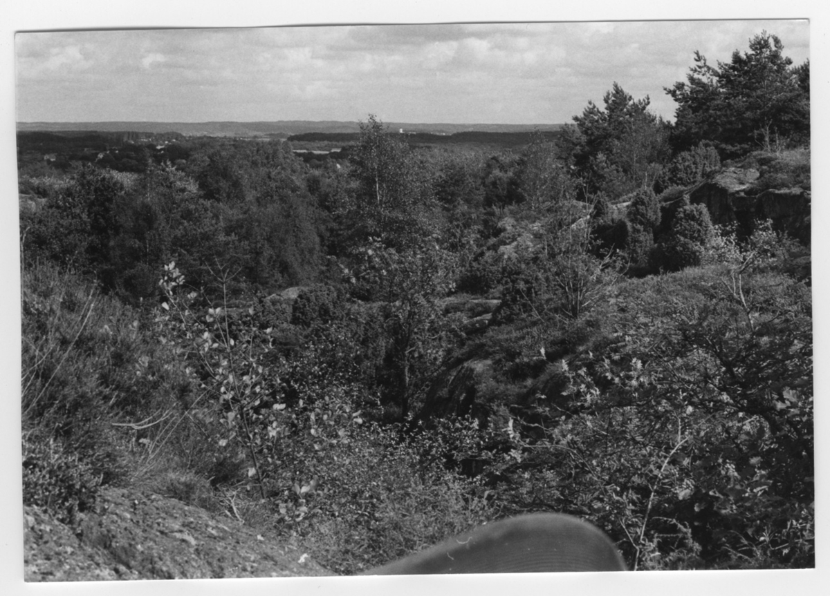 'Bildtext: ''Snårskog i skrevor. Riktning 60.'' :: I förgrunden berghäll med busk och trädvegetation, lövträd, enbuskar och barrträd. :: :: Ingår i serie med fotonr. 6970:1-1125, dokumentation av Hisingens naturgeografi, visande landskapsformerna i stora drag och gjord inför exploateringen av området. Platserna för fotograferingen finns utsatta på karta i skala 1:4000 som finns på Göteborgs Naturhistoriska musem. Fotoriktningen mättes med kompass i gammalgrader.'