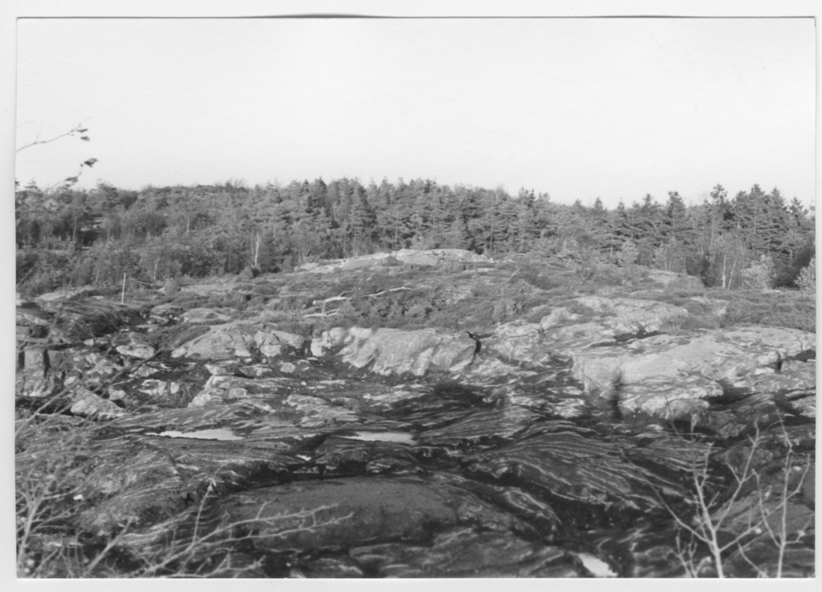 'Bildtext: ''Hällar. Riktning 56.'' :: Vy över kala berghällar och på avstånd barrträd. :: :: Ingår i serie med fotonr. 6970:1-1125, dokumentation av Hisingens naturgeografi, visande landskapsformerna i stora drag och gjord inför exploateringen av området. Platserna för fotograferingen finns utsatta på karta i skala 1:4000 som finns på Göteborgs Naturhistoriska musem. Fotoriktningen mättes med kompass i gammalgrader.'
