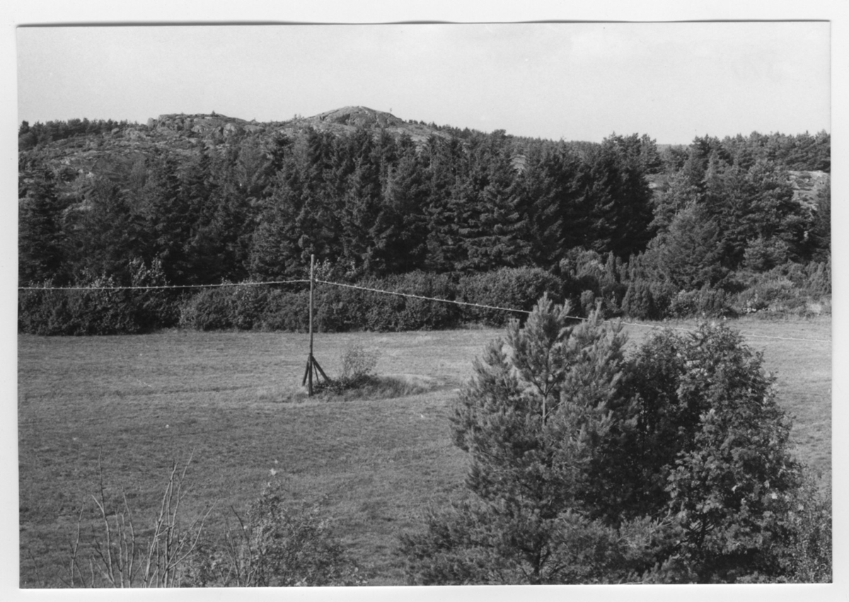 'Bildtext: ''Sedimentficka i hällandskap. Riktning 352.'' :: Vy med öppet fält, åkermark med barrträd intill och berghäll på andra sidan. :: :: Ingår i serie med fotonr. 6970:1-1125, dokumentation av Hisingens naturgeografi, visande landskapsformerna i stora drag och gjord inför exploateringen av området. Platserna för fotograferingen finns utsatta på karta i skala 1:4000 som finns på Göteborgs Naturhistoriska musem. Fotoriktningen mättes med kompass i gammalgrader.'