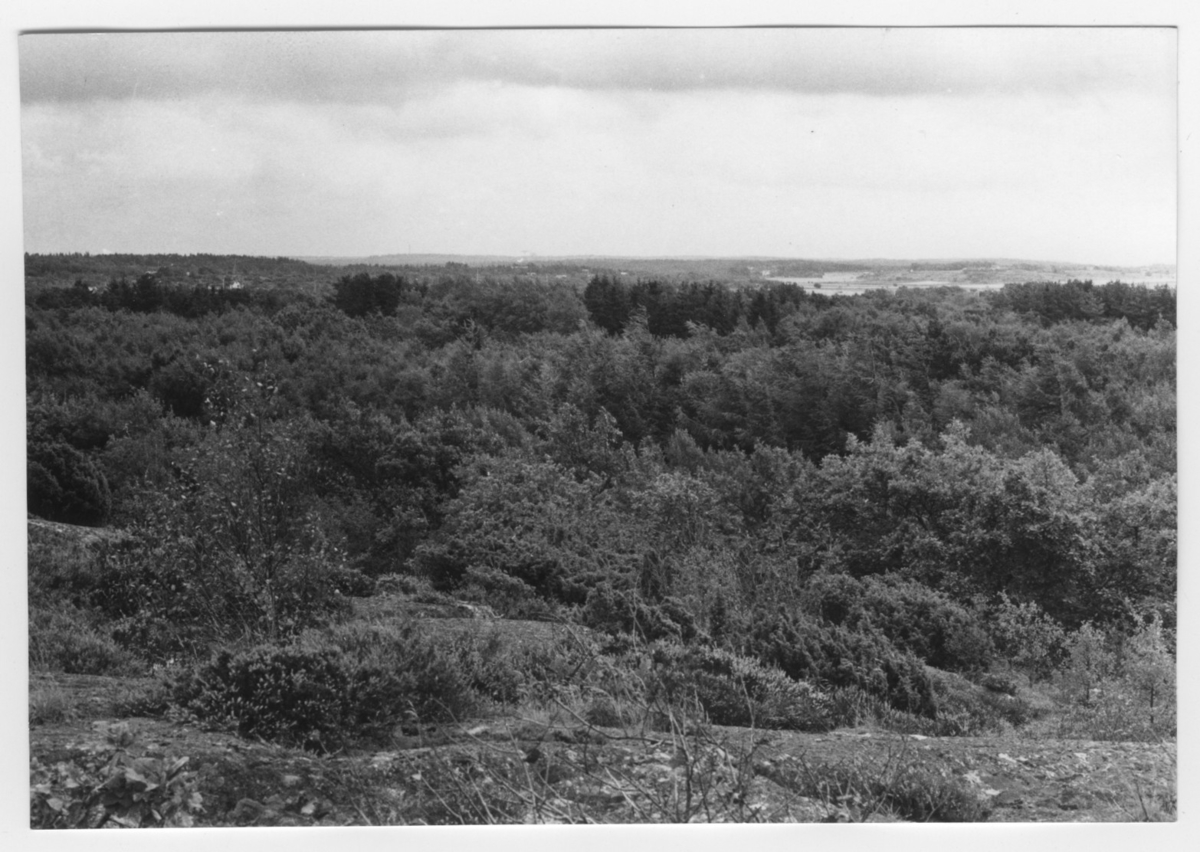 'Bildtext: ''Tät vegetation i diabasgång. Riktning 152.'' Vy med berghällar med enbuskar och ljung i förgrunden och vy ut över diabasgången med lövträd, gran och tallvegetation. :: :: Ingår i serie med fotonr. 6970:1-1125, dokumentation av Hisingens naturgeografi, visande landskapsformerna i stora drag och gjord inför exploateringen av området. Platserna för fotograferingen finns utsatta på karta i skala 1:4000 som finns på Göteborgs Naturhistoriska musem. Fotoriktningen mättes med kompass i gammalgrader.'