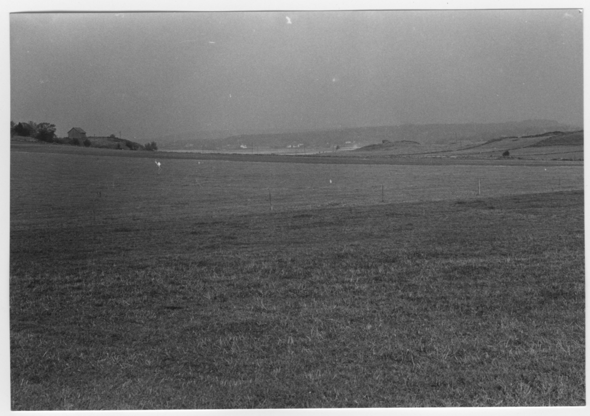 'Bildtext: ''Sedimentyta. Riktning 40.'' Vy över öppen gräsmark med staket. På avstånd syns liten byggnad på höjd. :: :: Ingår i serie med fotonr. 6970:1-1125, dokumentation av Hisingens naturgeografi, visande landskapsformerna i stora drag och gjord inför exploateringen av området. Platserna för fotograferingen finns utsatta på karta i skala 1:4000 som finns på Göteborgs Naturhistoriska musem. Fotoriktningen mättes med kompass i gammalgrader.'