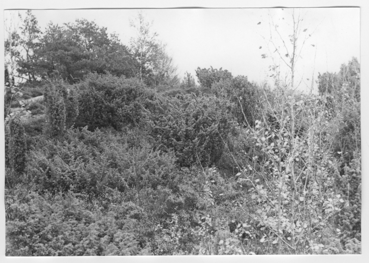 'Bildtext: ''Vegetation på bergknalle. Riktning 50.'' :: :: Ingår i serie med fotonr. 6970:1-1125, dokumentation av Hisingens naturgeografi, visande landskapsformerna i stora drag och gjord inför exploateringen av området. Platserna för fotograferingen finns utsatta på karta i skala 1:4000 som finns på Göteborgs Naturhistoriska musem. Fotoriktningen mättes med kompass i gammalgrader.'