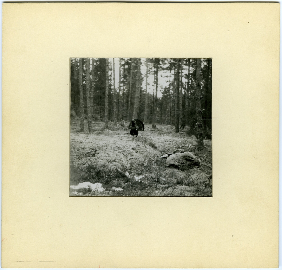 'Bildtext: ''Spelande tjädertupp.'' :: Vy med 1 spelande tjädertupp på lavklädd mark i furuskog. :: :: Ingår i serie med fotonr. 7083:1-55.'