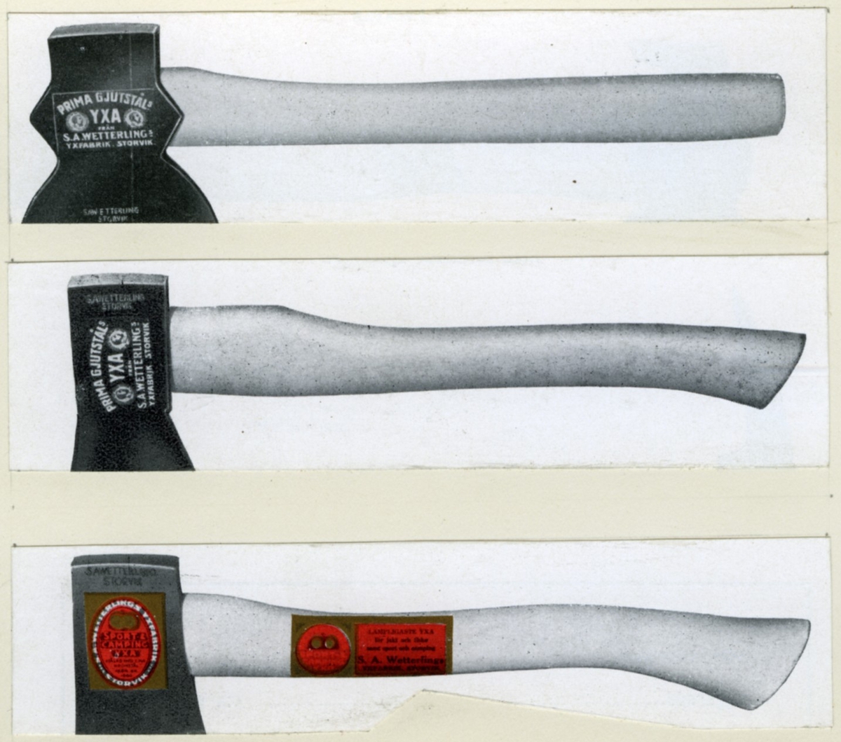 '3 olika modeller av yxa. :: :: Fotonr. 7046:335-353 indelade som ''Skogsavverkning och virkestransport.'' Ingår i serie med fotonr. 7046:1-383, 7047:1-33 och 7048:1-67 med bilder från Länsjägmästare John Lindners bildarkiv.'