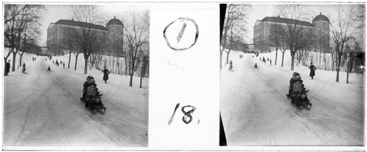 'Bildtext: ''Kälkbacke vid Sturevalven.'' :: Vy med snöklädd mark, människor spridda i backe nedanför slottsbyggnaden. I förgrunden en mindr egrupp människor på en kälke. :: :: Ingår i serie med fotonr. 5254, se även hela serien med fotonr. 5237-5267.'