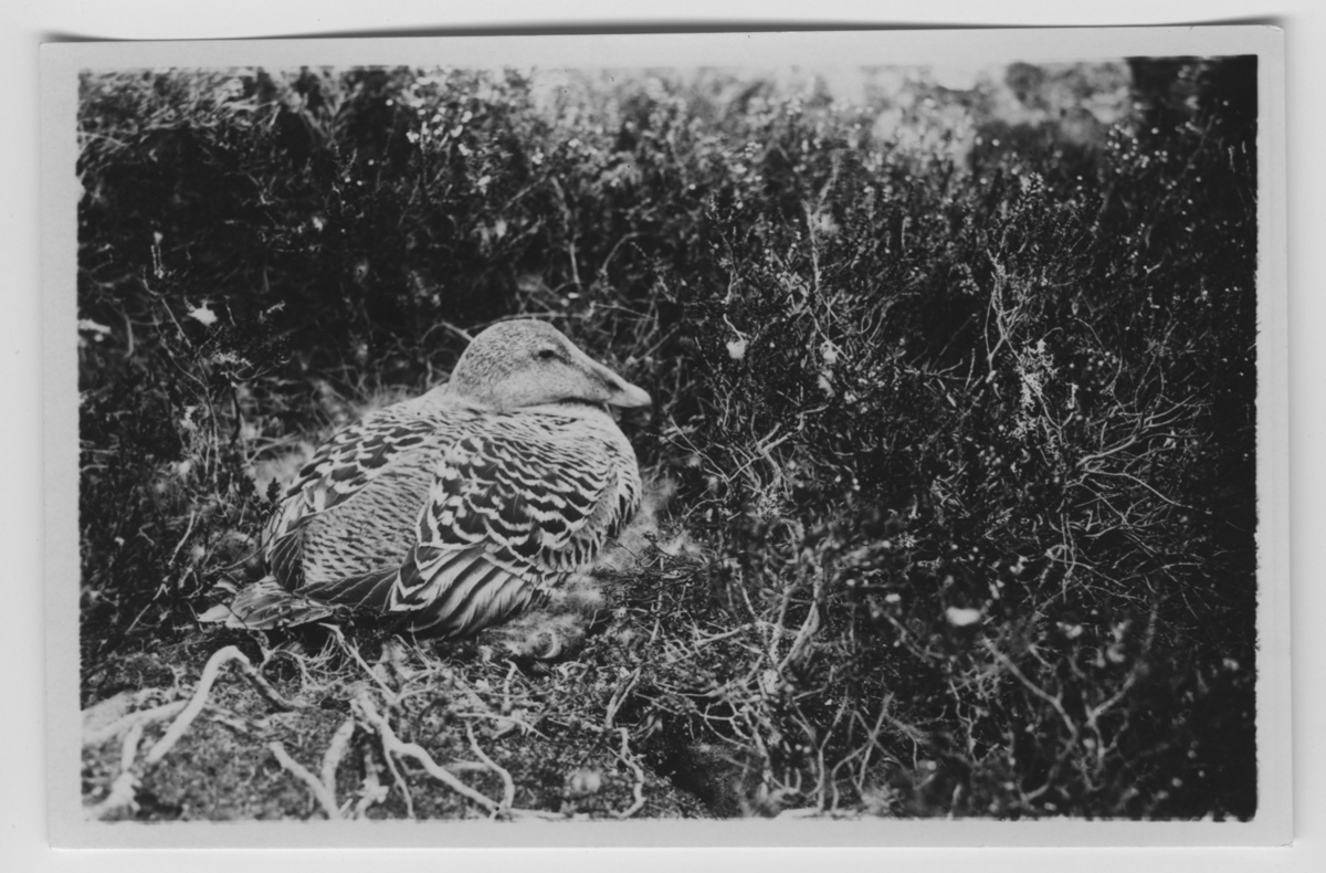 'Ruvande åda, vuxen ejderhona balnd ljungris. :: :: Se serie med fotonr. 3151-3200. Se även fotonr. 1771-1837.'