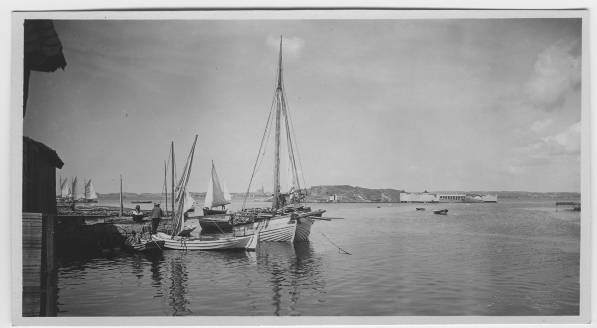 'Utsikt åt norr med Mansholmen. Båtar vid brygga. 3 män invid bryggan. :: :: Serie fotonr 1888-1963.'