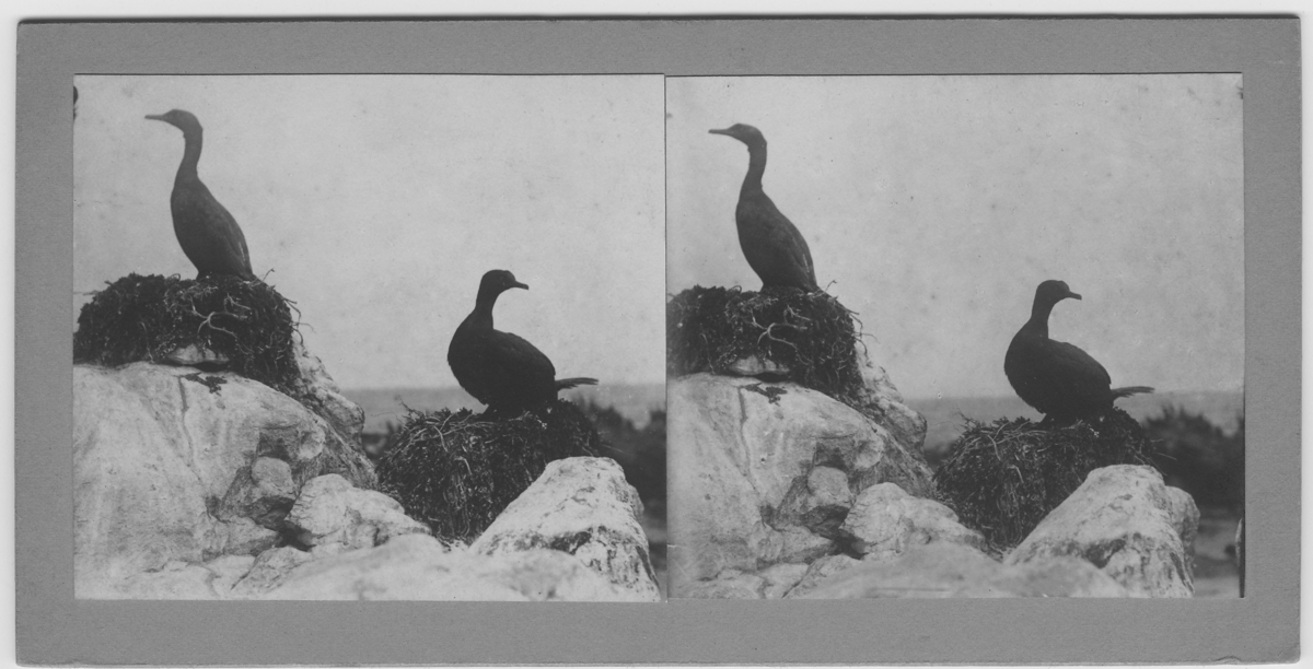 '2 skarvar på bon. Närbild. :: :: Ingår i serie med fotonr.167-179, 181-184, 186-191, 193-196, 198-203 samt 205-215 med foton från Hilmer Skoogs expedition till Sydafrika år 1912-1913.'
