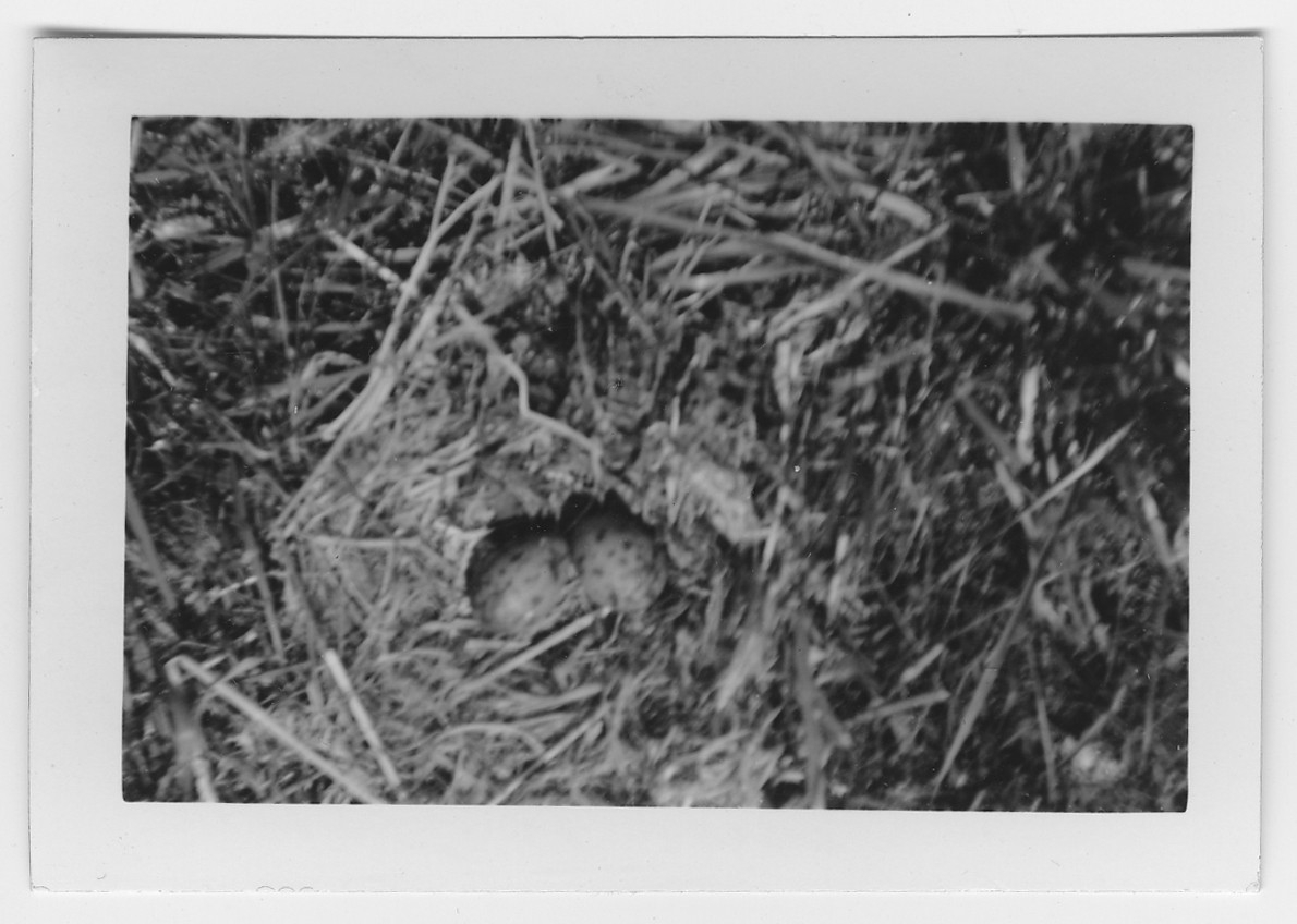 'Bo med 2 st ägg av dvärgmås. Oskarp bild. :: :: Text på baksidan av fotot: ''Bo med 2 st fullruvade ägg av dvärgmåsen, det enda boet i skrattmåskolonin på ca 300 par i en starrgräsmad mellan Getterön och järnvägen. Äggens längd var 42 mm samt 30 mm breda. Reden, som bestod av torrt starrgräs låg 2 meter från skrattmåsboet med de nyfödda ungarna.'' :: :: Ingår i serie med fotonr. 4544:1-35.'