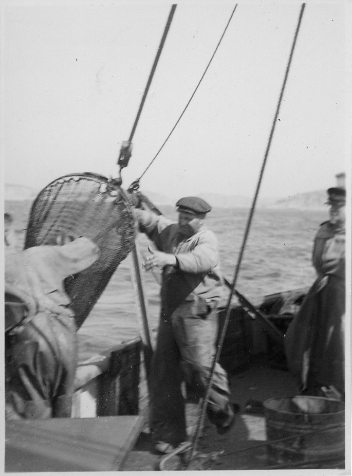 'Skandiaexpeditionen 1935: :: :: 3 personer på båtdäck, 2 män arbetar med en håv på en lina. Ytterligare 1 man står och betraktar deras arbete. :: :: Ingår i serie med fotonr. 3441-3452.'