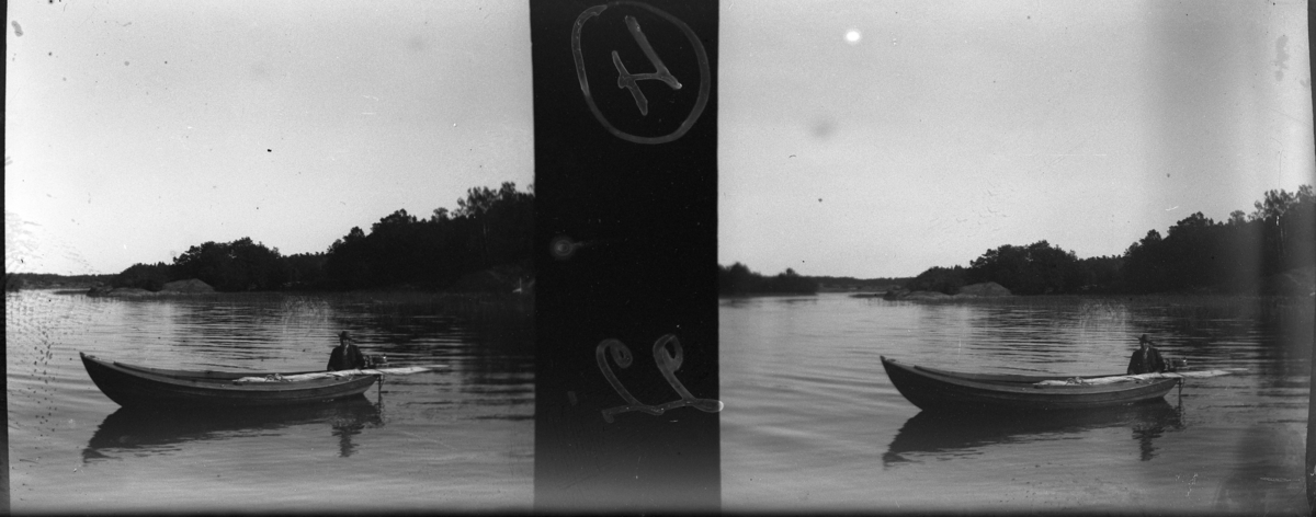 'Bildtext: ''Skebol, M.L. i båten.'' :: Vy med 1 man, Magnus Leijer i båt med nedlagt segen. :: :: :: Ingår i serie med fotonr. 5258:1-16. Se även hela serien med fotonr. 5237-5267.'