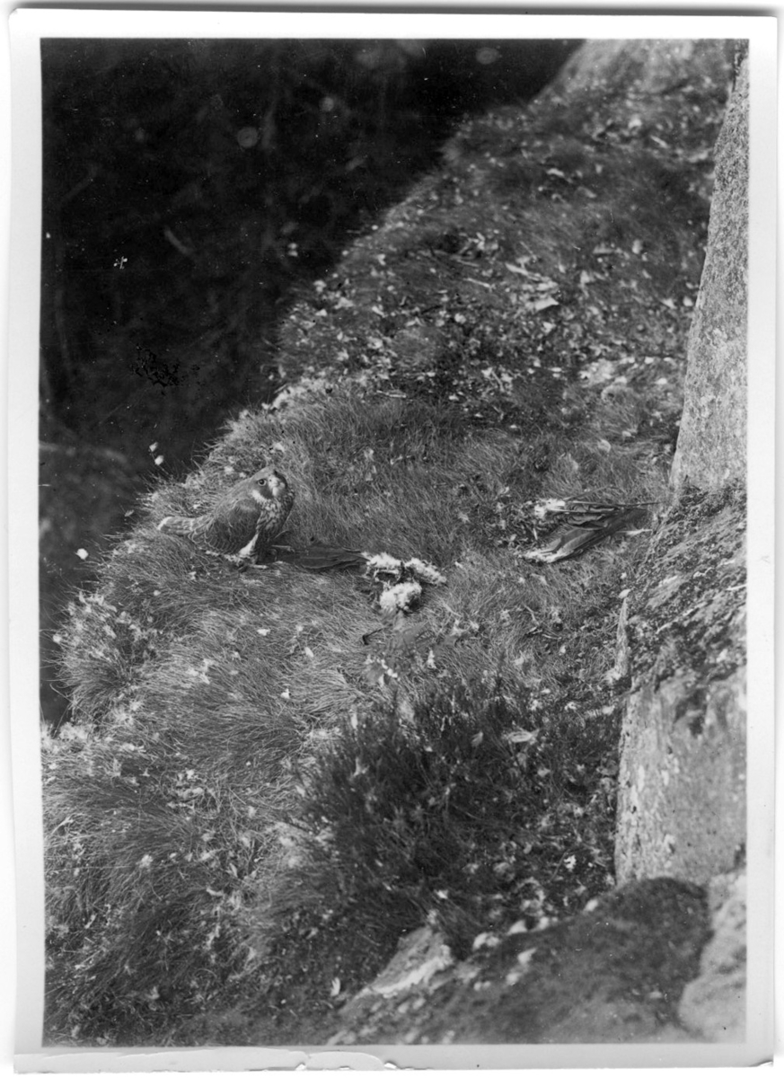 'Pilgrimsfalk med rov på ''bohyllan''. Resterna av rovet, vingar, ligger på klippavsatsen. :: :: Ingår i serie med fotonr. 1771-1837. Se även fotonr. 3151-3200.'