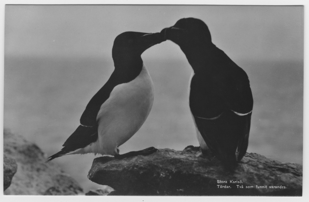 '2 st tordmular på stenblock. Näbbarna mot varandra. Närbild. Text till fotot: ''Tördar, två som funnit varandra''. :: :: Ingår i serie med fotonr. 2462-2487.'